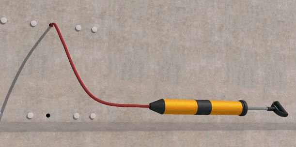 连接灌浆筒与空压机通气管。灌浆管插入灌浆孔,空压机开始增压。